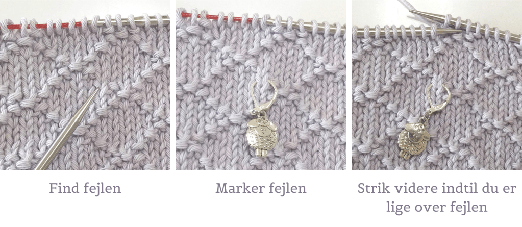Ofte, når vi laver en fejl, så er det ikke bare en enkelt maske, der skal rettes fra ret til vrang eller omvendt. Hvis vi har talt forkert, så vil det typisk være en hel sektion af mønsteret, der er blevet skubbet. Det er derfor, det er en rigtig god ide at bruge strikkemarkører til at hjælpe dig med at tælle masker og holde styr på mønsteret, så du opdager dine fejl tidligt. Når du opdager en fejl tidligt, så kan du nøjes med at strikke baglæns nogle få masker, og så strikke videre. Når du derimod opdager en fejl meget længere nede i strikketøjet, så skal du vurdere, om du kan rette den med drop-down-to-fix, eller om det er bedre at trevle op til ned forbi fejlen, og strikke hele stykket efter fejlen en gang til.