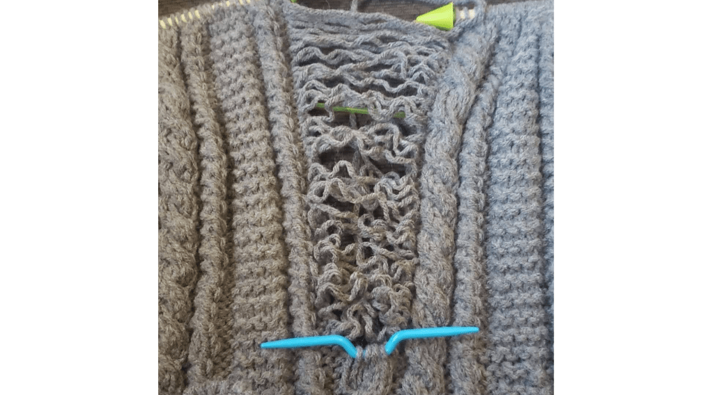 Jeg bruger selv reparationsnålene fra Knitpro, som jeg også sælger i webshoppen. De er designet til formålet og har netop et helt smalt skæfte, der gør det nemt at trække dem hele vejen igennem en maske. Den anden ende er spids som en strikkepind, og det er virkelig praktisk at have en ekstra strikkepind ved hånden. Jeg bruger den spidse ende til alt muligt. Den er f.eks. god til at tælle masker og pinde, eller til at trække ud i masker, hvis der er lidt løst garn, der skal omfordeles.