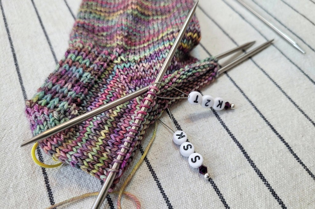 I sidste afsnit sluttede vi af med at placere strikkemarkører imellem vristmasker og kilemasker på begge sider af sokken. Det ser sådan her ud: