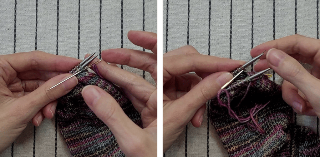 I sidste afsnit viste jeg hvordan tåindtagningerne strikkes, og når tåindtagningerne er færdige, så er der i alt 16 masker tilbage på pindene.