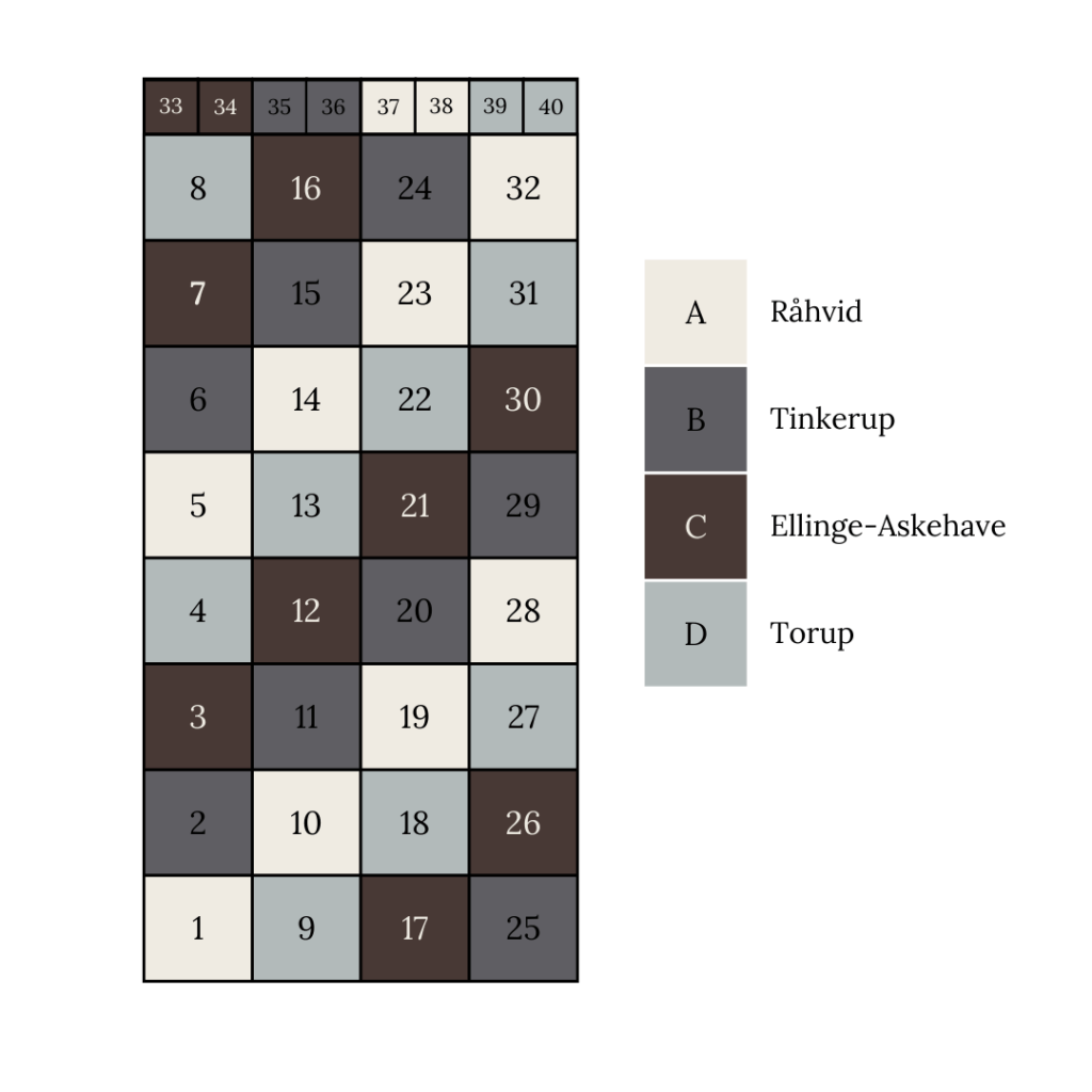 Domino Puden er i udganspunktet tænkt til at have fire farver, der går igen systematisk i et diagonalt mønster. Det klæder dominofirkanterne, der i sig selv har et diagonalt strukturmønster.