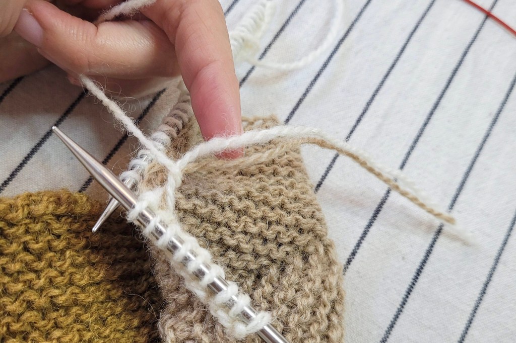 De løse garnender hæftes på bagsiden, samtidigt med de første masker af den nye pind strikkes. Det gøres ved at vikle garnenden rundt om arbejdsgarnet, efter hver maske er blevet strikket, på hver af de første ca. 8 masker af pinden.