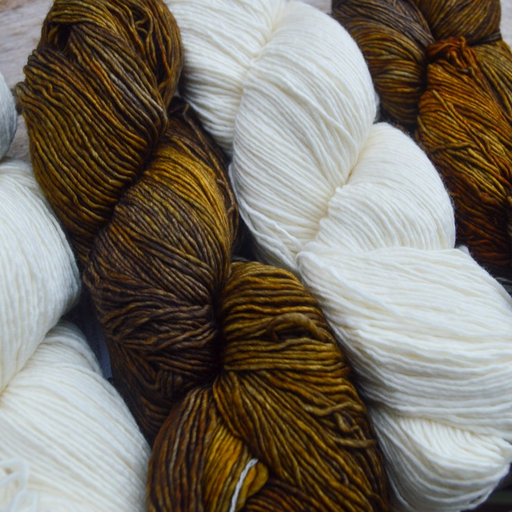 De 3 farver skal selvfølgelig klæde hinanden side om side. 2 af farverne skal have høj kontrast til hinanden, hvorimod den 3. farve er en accentfarve, der ikke behøver have en høj kontrast til de andre to. Sjalet fungerer bedst med garner, der er ensfarvede eller semisolide (det vil sige farver der har lidt spil, men holder sig til en eller to nuancer tæt på hinanden). Det sikrer, at de forskellige mønstre får lov at fremstå tydeligt. Jeg har sammensat en række garnpakker til sjalet i det anbefalede garn Malabrigo Mechita, og der er mange skønne farvekombinationer at vælge imellem. Garnpakkerne kan også blot bruges til inspiration, hvis du hellere vil strikke i et andet garn.