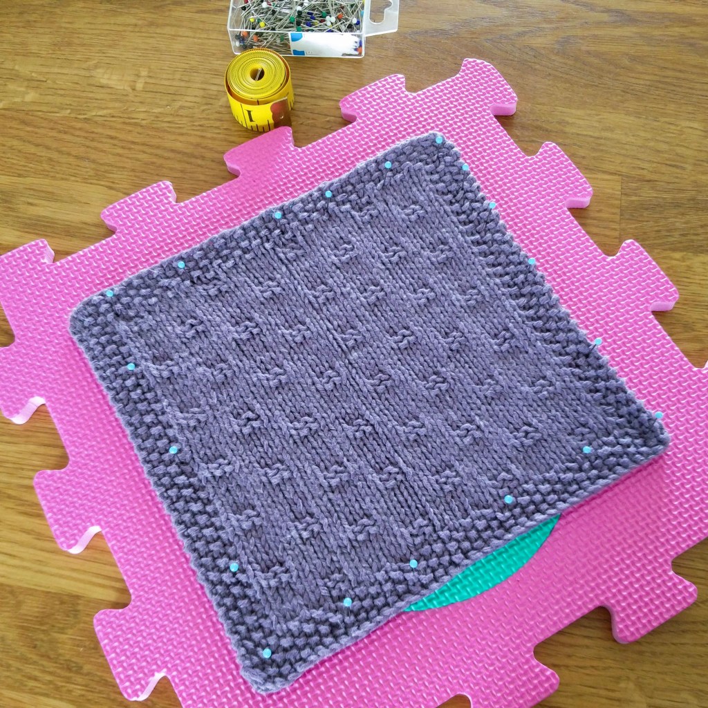 Når vasken er færdig tages strikkeprøven ud, imens den stadig er helt fugtig, og så spændes den ud på en blokkingmåtte med stoppenåle. Hvis du strikker med Mechita garnet, vil du med det samme opleve, at prøven er vokset. Spænd stoffet ud, så det er en smule udspændt i forhold til at være afslappet, men ikke for meget. Her er kun brug for en let blokning. Brug rigeligt med stoppenåle, så at kanterne er lige. Lad nu strikkeprøven tørre natten over.