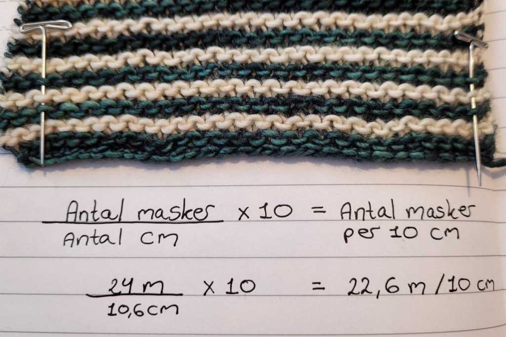 Derfor er min strikkefasthed før vask: 24 * 10 / 10,6 = 22,6 masker per 10 cm